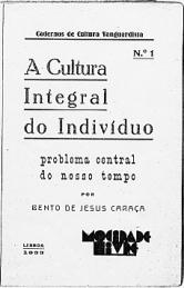 versão para imprimir - aquiBento de Jesus Caraça18/04/1901 – 25/06/1948Bento de Jesus Caraça foi um notável matemático português, professor universitário, resistente antifascista e militante do Partido Comunista Português. Nasceu em Vila Viçosa a 18 de abril de 1901, filho de João António Caraça e Domingas Espadinha e irmão de António, Francisco e Filomena.Iniciou e completou os estudos primários em Vila Viçosa, em 1911, tendo ido então para o Liceu de Sá da Bandeira, em Santarém. Já com 13 anos mudou-se para Lisboa, onde concluiu os seus estudos do ensino secundário em 1918, no Liceu Pedro Nunes. Nesse mesmo ano faz a sua inscrição Instituto Superior de Ciências Económicas e Financeiras, obtendo a licenciatura em 1923. Entretanto, em 1919 é nomeado 2.º assistente do ISCEF e em 1924 é nomeado 1.º assistente, tendo no ano letivo de 1924-1925 regido a cadeira de Matemáticas Superiores - Análise Infinitesimal, Cálculo das Probabilidades e suas Aplicações.Mais tarde, em 1927, foi nomeado professor extraordinário e, em 28 de Dezembro de 1930, foi nomeado professor catedrático da cadeira de Matemáticas Superiores - Álgebra Superior. Princípios de Análise Infinitesimal. Geometria Analítica, a qual manteve a regência sua demissão compulsiva em 7 de Outubro de 1946.No ano de 1930 publica as suas lições em livro Interpolação e Integração Numérica, em 1933 A Cultura Integral do Indivíduo - problema central do nosso tempo, na qual esboça um programa de intervenção cultural, científica e pedagógica. Em 1935 o 1.º volume das Lições da Álgebra e Análise.No ano de 1936 acaba por fundar com outros recém doutorados nas áreas da matemática e física o Núcleo de Matemática, Física e Química e em 1937 publica em 2 volumes Cálculo Vectorial. No ano seguinte, numa tentativa de trazer para Portugal a econometria, funda com os professores Mira Fernandes e Beirão da Veiga o Centro de Estudos de Matemáticas Aplicadas à Economia.Bento de Jesus Caraça foi também o fundador de Biblioteca Cosmos, edição de livros de divulgação científica e cultural, em1941 e publica o 1.º volume dos Conceitos Fundamentais da Matemática. Dois anos depois, em 1943, torna-se o 2.º presidente da Sociedade Portuguesa de Matemática em conjunto com Aureliano de Mira Fernandes, cargo que ocupou até 1944.Em 1946, devido ao seu envolvimento político, acaba por ser preso pela PIDE e nesse mesmo ano o Conselho de Ministros determina a sua expulsão da cátedra universitária e fica proibido de exercer a docência.A 25 de junho de 1948 acaba por falecer, vítima de doença cardíaca.Livros publicados1930Interpolação e Integração Numérica1933A Cultura Integral do Indivíduo – Problema central do nosso tempo, onde escreve um programa de intervenção cultural, científica e pedagógica1935Lições da Álgebra e Análise1937Cálculo Vectorial1941Conceitos Fundamentais da MatemáticaSites recomendadoshttp://www.epbjc-porto.net/bjc/index.htmlhttp://cvc.instituto-camoes.pt/ciencia/p19.htmlhttp://dererummundi.blogspot.pt/2011/06/sobre-bento-de-jesus-caraca-1901-1948.htmlhttp://pt.wikipedia.org/wiki/Bento_de_Jesus_Cara%C3%A7ahttp://www.educ.fc.ul.pt/docentes/opombo/seminario/bento%20caraca/biografia.htm